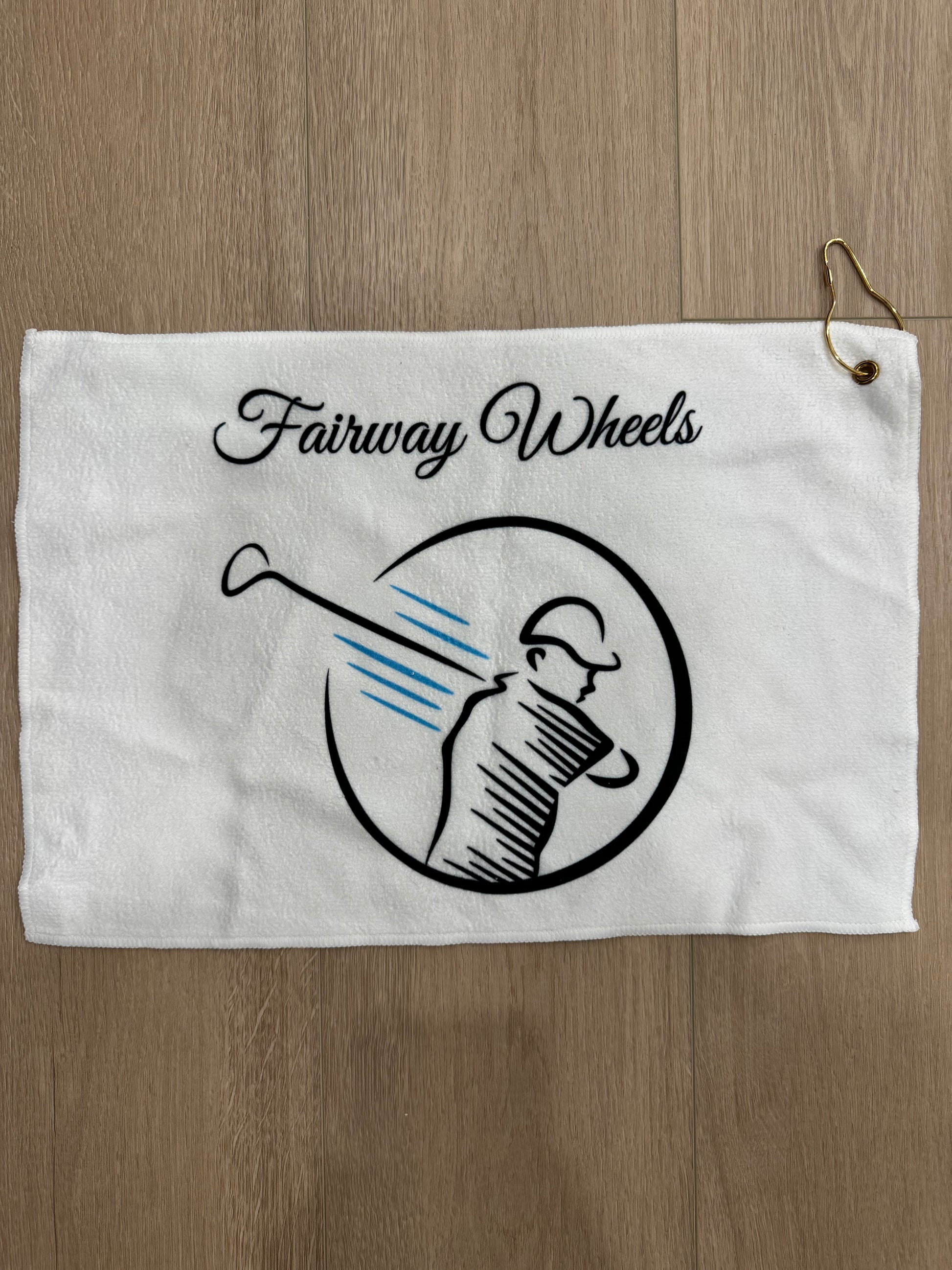 Featuring the Fairway Wheels logo embroidered in bold detail, it brings a clean and classic look to any golf bag. The included gold metal clip adds a touch of style and durability, making it easy to secure your towel to any bag or cart.